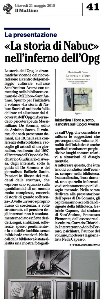 La storia dell’Opg, le drammatiche vicende dei ricoverati sono al centro del gemellaggio culturale sull’asse Sant’Antimo-Aversa con un meeting nella biblioteca comunale «Mi Libro» Sant’Antimo. Spunto per l’iniziativa il volume «La storia di Nabuc - Storie di ordinaria follia delirate ed allucinate dai ricoverati dell’Opg di Aversa», dello psicoterapeuta Massimiliano De Somma, edito da Arduino Sacco. Il volume, che sarà presentato domani, alle 18, nella sala conferenze della biblioteca, raccoglie gli articoli di un giornalino, realizzato dal 1997, all’interno dell’Ospedale Psichiatrico Giudiziario di Aversa, dagli internati, sotto la guida di De Somma e del giornalista Raffaele Sardo. Pensieri in libertà dei residenti della struttura, che «aprono uno squarcio sulla quotidianità di un mondo molto complesso, crocevia di storie di grande sofferenza». A volte un vero e proprio flusso di coscienza, a volte strutturato, «il pensiero degli internati non è assolutamente mediato e riflette desideri, sogni, ambizioni, sofferenze, spesso pentimento», e la cui «folle lucidità» senza inibizioni è creatività. Nei locali della biblioteca è stata allestita una mostra fotografica sull’Opg, che consolida e rafforza le suggestioni che provengono dal volume. Finalità dell’iniziativa è anche quella di combattere pregiudizio e luoghi comuni relativi a situazioni di disagio mentale. A rafforzare questo, che è tra i motivi conduttori dell’evento, sempre nella biblioteca, è stato allestito, fino a domani, uno sportello informativo di orientamento per il disagio mentale. Nella serata dedicata alla presentazione dell’opera di De Somma, gli ospiti saranno accolti dal dirigente della biblioteca, Gabriele Capone, dal sindaco di Sant’Antimo, Francesco Piemonte, dall’assessore alla cultura, Corrado Chiariello. Interverranno Adolfo Ferraro, psichiatra, l’autore del volume, modererà la giornalista Nella Capasso.Dott. Massimiliano De Somma, Psicologo, Psicoterapeuta, Sessuologo, Counselor professionista, Formatore e Docente Scuole di Specializzazione in Psicoterapia, Psicoterapia della Gestalt, Analisi Transazionale, Approccio Cognitivo Comportamentale, Terapia trasformativa, Psicologo Napoli, Psicoterapeuta Napoli, Psicoterapia Napoli, https://www.psicoterapia-napoli.it